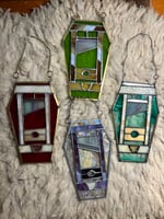 A smaller more colourful version of my original guillotine piece. This one crafted with ‘realistic’ wood coloured glass on a baroque blue background and an iridescent grey blade. The background is cut to be the shape of a casket as it was created to be part of my Halloween collection