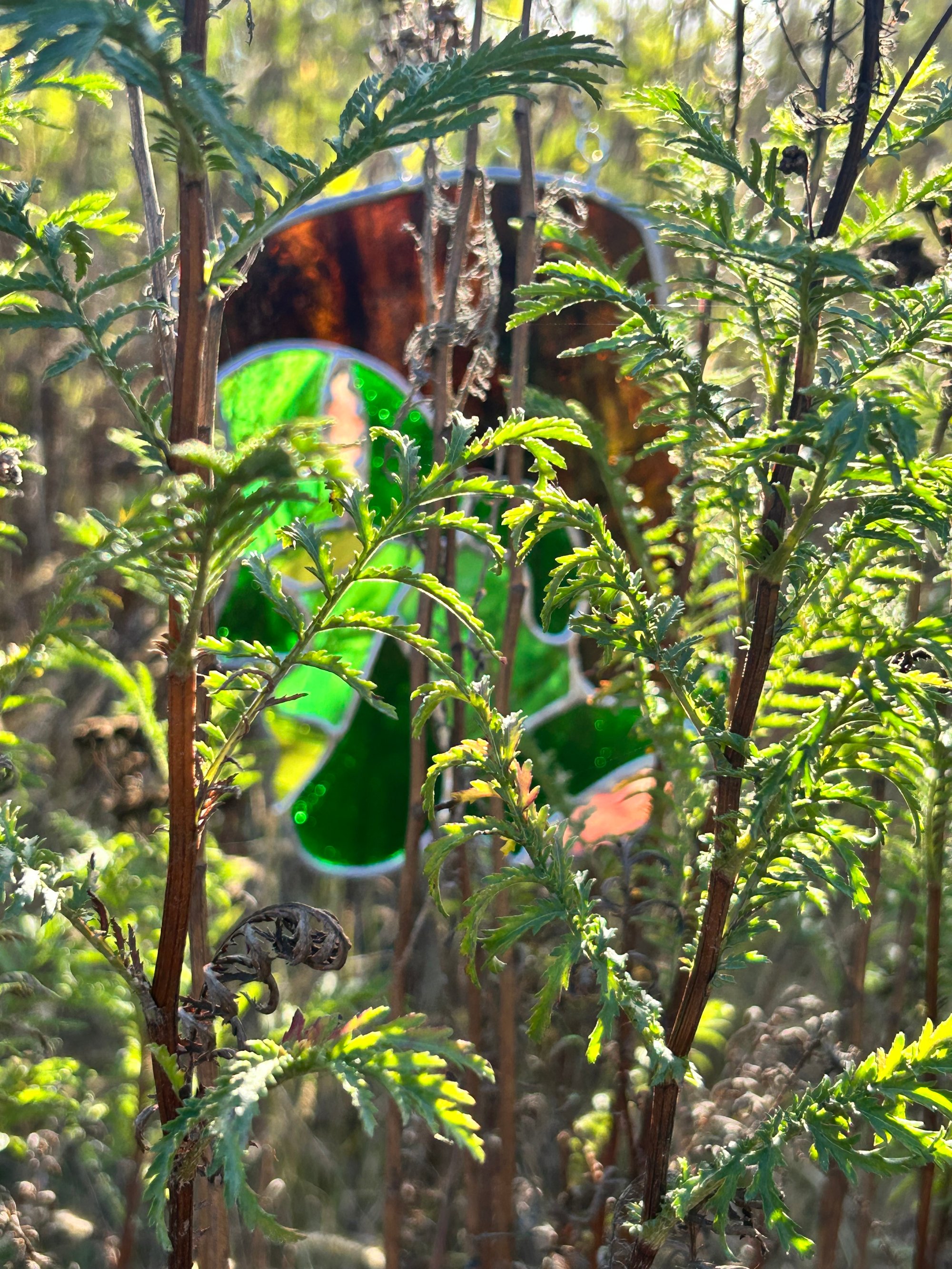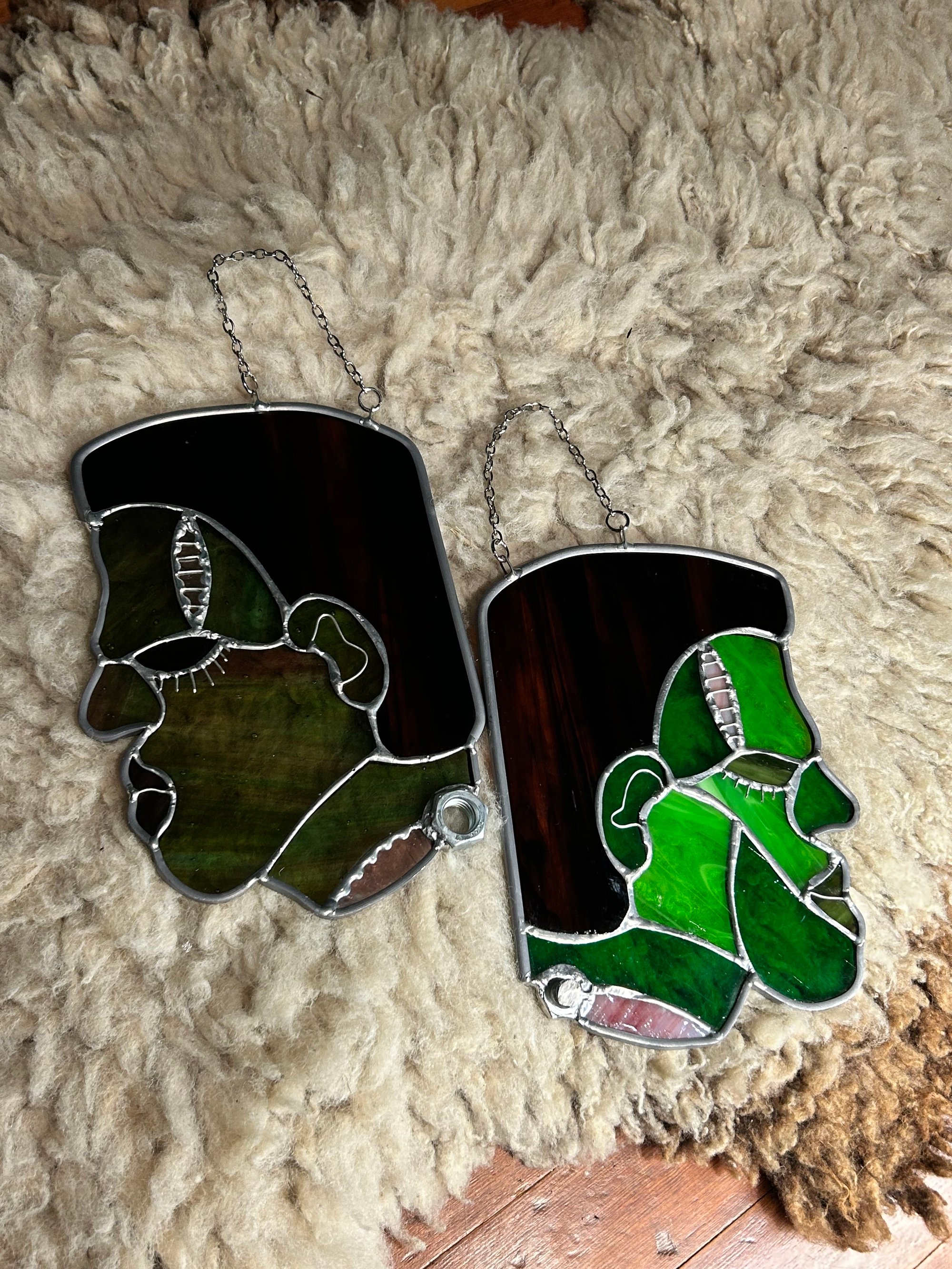 This floating head was made with multiple pieces of green, pink, and brown glass segments