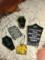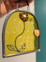 Small headstone shaped ‘So it goes’ suncatcher made with kiln fused flowers and lettering on yellow glass